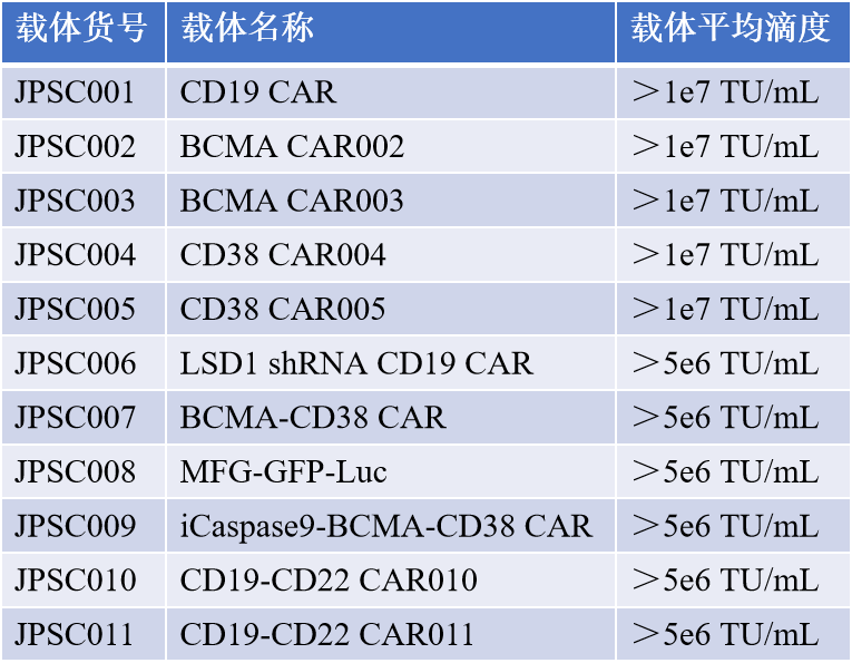 根据客户需求可定制化研发,在500 mL范围内生产科研级逆转录病毒载体。给予了从抗体筛选、载体构建、病毒载体包装到CAR-T细胞制备、CAR-T细胞体内外活性验证等CDMO服务的整体解决方案。同时,该公司可以给予针对多种肿瘤靶点的CAR特异性逆转录病毒载体产品,如BCMA、CD19、CD38、CD22、EGFR/EGFRV III等的CAR特异性逆转录病毒载体成品,均可高效转导人类原代T细胞。其中CD38 CAR为我司顺利获得噬菌体展示scFv抗体库筛选得到的全人源anti-CD38 scFv结构,具有自主知识产权.