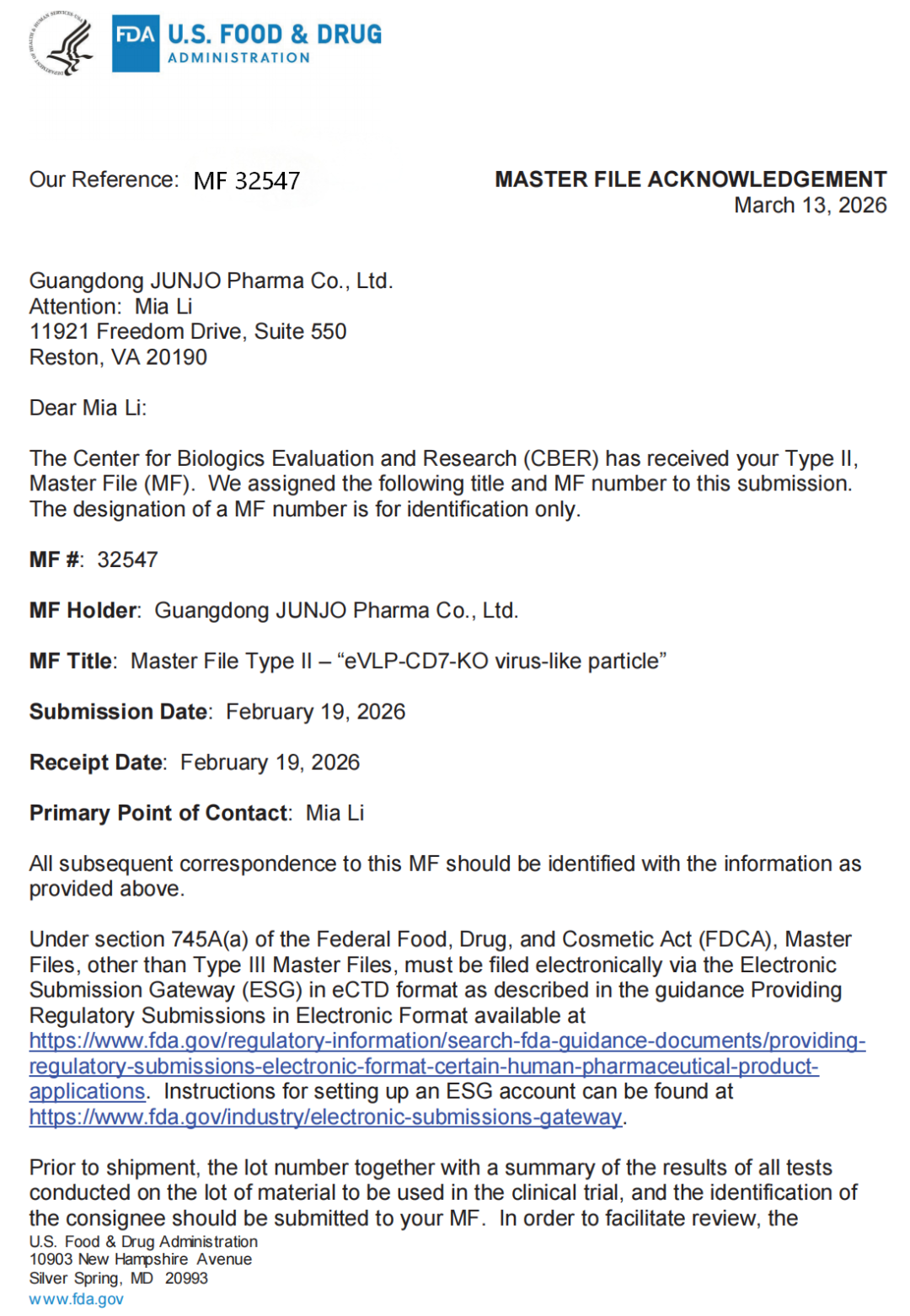 近期,奥林匹斯之门 pp电子奥林匹斯之门集团在细胞与基因治疗核心技术国际化方面取得重要里程碑进展。集团全资子公司广东君厚生物医药有限公司自主研发的 “eVLP-CD7-KO virus-like particle(CD7基因敲除工程化类病毒颗粒)” 已正式完成美国食品药品监督管理局(FDA)Drug Master File(DMF)备案,备案号 MF 32547,并取得美国 FDA 生物制品评估与研究中心(CBER)受理确认。