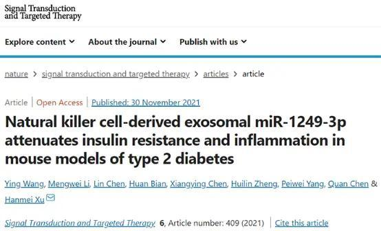 [1] Wang, Y., Li, M., Chen, L. et al. Natural killer cell-derived exosomal miR-1249-3p attenuates insulin resistance and inflammation in mouse models of type 2 diabetes. Sig Transduct Target Ther 6, 409 (2021).