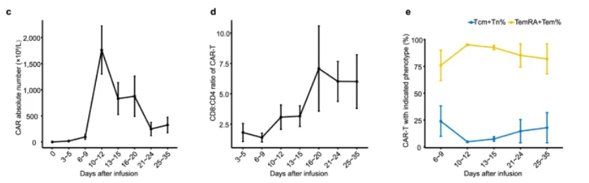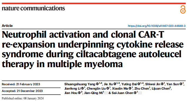 最近,上海交通大学医学院附属瑞金医院陈赛娟院士团队在《Nature Communications》上发表题为“Neutrophil activation and clonal CAR-T re-expansion underpinning cytokine release syndrome during ciltacabtagene autoleucel therapy in multiple myeloma”的论文,文中对26例接受Cilta-cel(由强生/南京传奇公司开发的靶向BCMA抗原的双表位CAR-T产品)治疗的的r/r MM患者的外周血(PB)血清细胞因子水平和循环免疫细胞转录组进行了纵向监测,以分析CRS的免疫动力学。CRS的严重程度可以顺利获得时间细胞因子分泌特征准确描述和潜在预测。研究结果表明,在明显的CRS之前有一个具有明显免疫变化的潜伏期,为CRS治疗干预给予了最佳窗口和潜在靶点,CAR-T再扩展需要密切的临床关注和实验室研究,以降低致死风险。