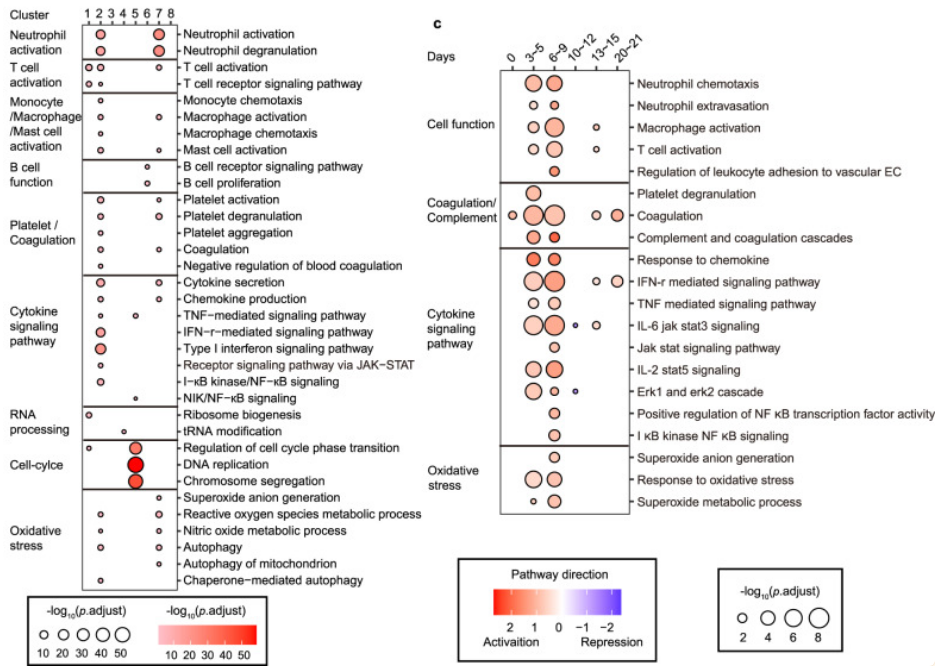 此外,为了更好地分析免疫细胞活化级联反应的时间,研究人员还进行了基因集富集分析(GSEA),将每个时间点与基线进行比较。发现中性粒细胞在第3~5天(潜伏期)反应最强,而巨噬细胞和T细胞的免疫反应从潜伏期开始,并在第6~9天的发烧期强烈反应,表明中性粒细胞是引发炎症反应的先驱,而巨噬细胞和T淋巴细胞更多地参与随后的细胞因子级联反应。随着免疫细胞的反应,关键的炎症信号通路TNF、IL-6/JAK-STAT3、JAK/STAT、IL-2/STAT5和补体/凝血级联反应相应显著上调,而顺利获得基因集评分也得出了类似的结论。这些数据可以预测潜在靶点和使用信号阻滞剂的适当时间。
